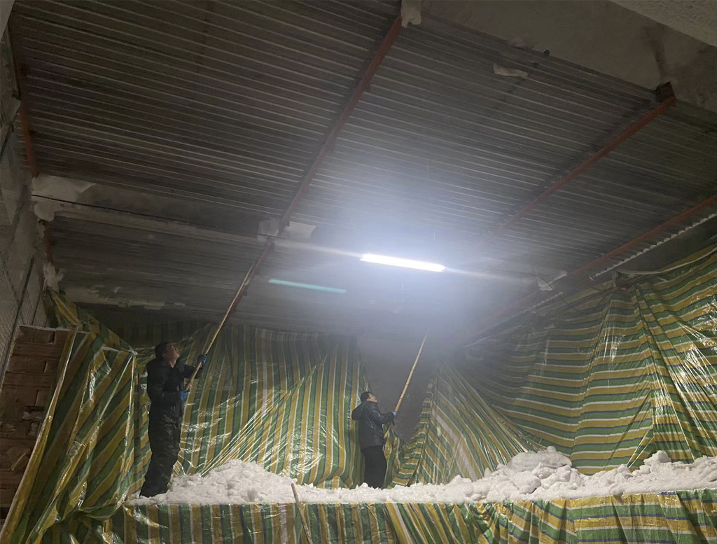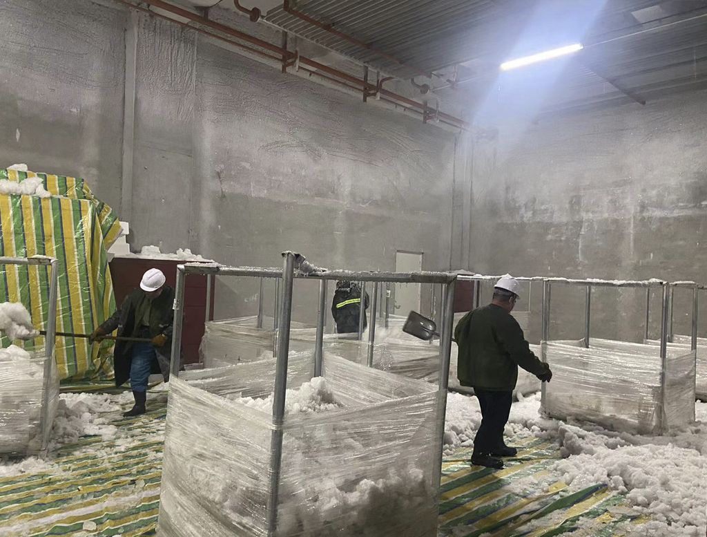 除冰、除霜工作開始前,設(shè)備人員對(duì)冷庫設(shè)備進(jìn)行全面檢查,設(shè)置警示標(biāo)志,確保除冰、除霜設(shè)備運(yùn)轉(zhuǎn)正常及作業(yè)人員的人身安全。除霜工作系低溫作業(yè),雖然面臨著手僵直、拿不穩(wěn)、冰面滑、站不穩(wěn)等困難,但是中凱作業(yè)員工一干就是6、7個(gè)小時(shí)。