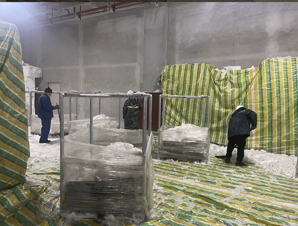 中凱智慧冷鏈物流園內(nèi)中凱冷庫作為集低溫庫、高溫庫、恒溫庫和大型裝卸平臺(tái)等功能為一體的綜合性冷庫,專注農(nóng)產(chǎn)品冷鏈存儲(chǔ)及短期周轉(zhuǎn)存儲(chǔ)。為使冷庫保持穩(wěn)定庫溫,確保貨物儲(chǔ)存品質(zhì),降低設(shè)備能耗,中凱冷庫負(fù)責(zé)人組織作業(yè)人員、設(shè)備人員、協(xié)調(diào)搬運(yùn),共同開展A103冷庫除冰、除霜工作。